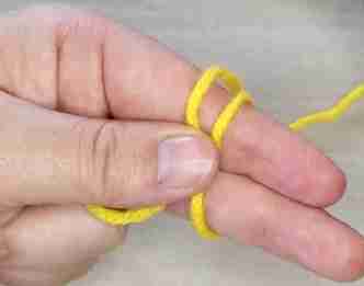 Begin holding the tail of your yarn in your left hand, hold it with your ring finger and pinky.
